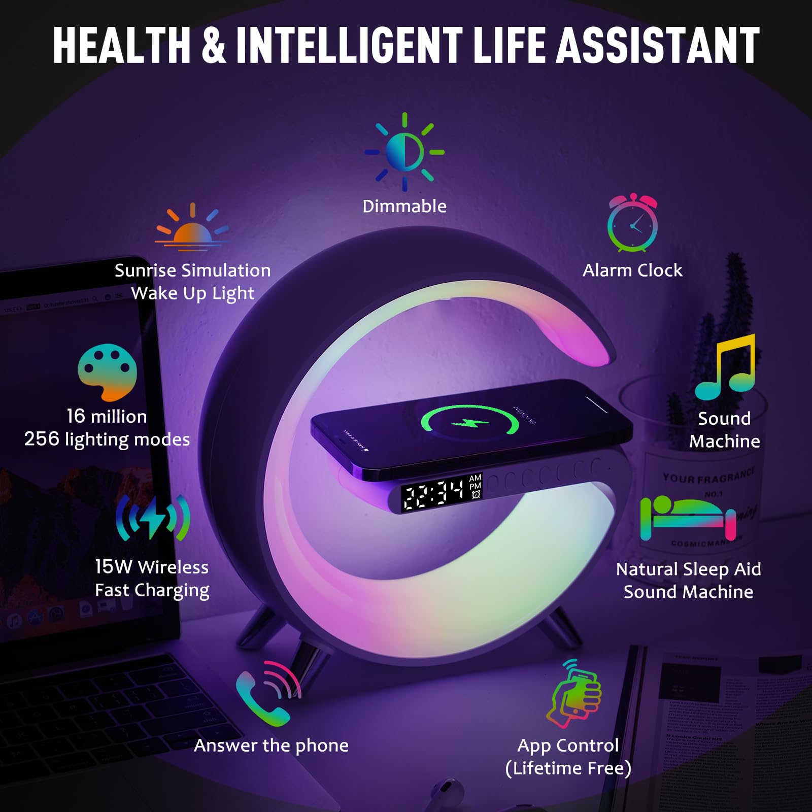- 【Sunrise Simulation Alarm & 15W Wireless Charging】Personalize your wake-up routine. The sunrise alarm feature begins to glow three minutes before your set alarm time. It also features a 15W wireless charger, compatible with smartphones for added daily convenience