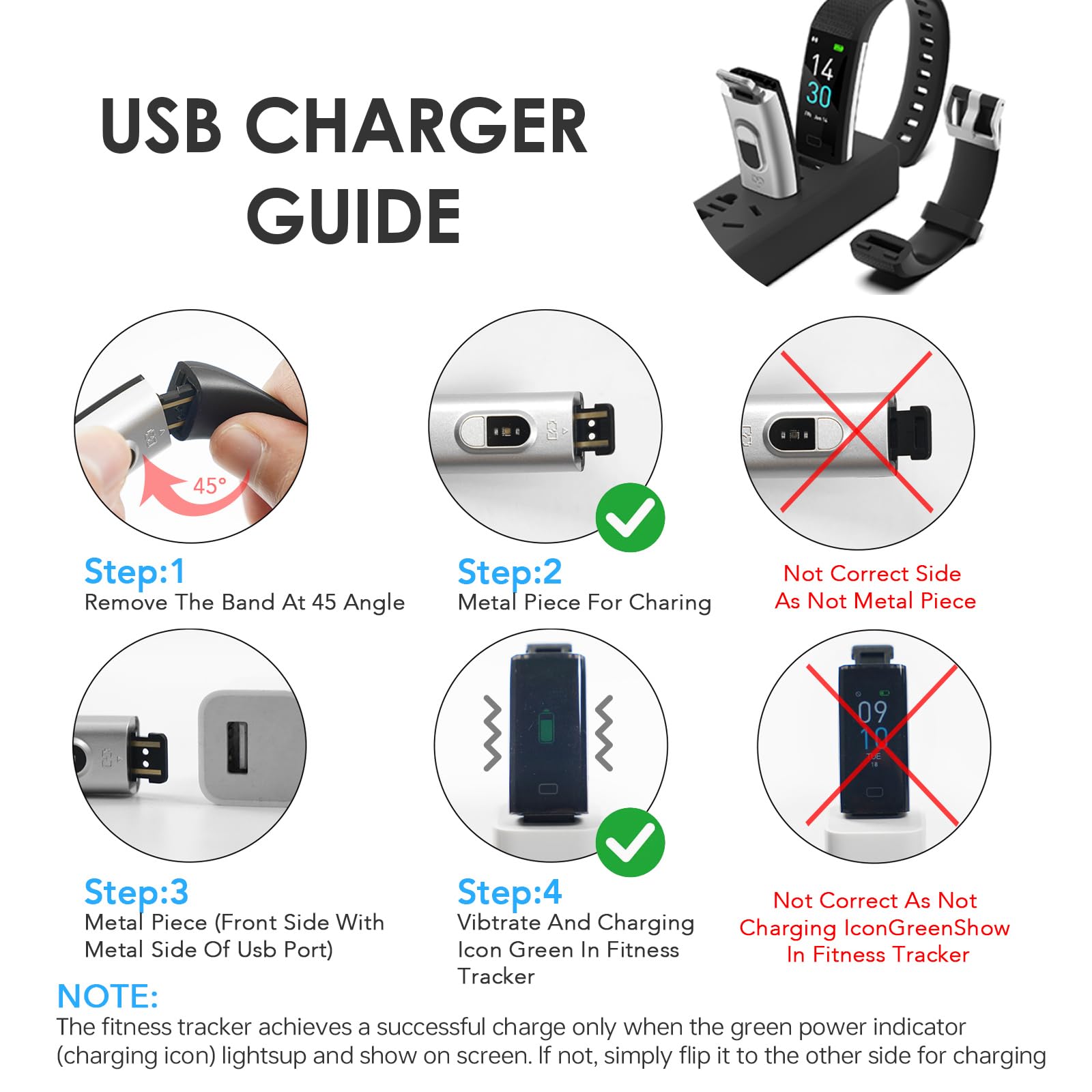 - 【Build-in USB Charger&Long Working time】- The fitness tracker has not extra charging cable .It is built-in USB plug, which can be charged directly on any computer and USB charger; no adapter and charging cable required. It takes only 2 hours to charge and can be worked for 5-7 days (Noted: Both sides can be removed,but just one side with metal piece can be charged. pls plug the metal piece with charging icon into any USB port . Also,If the green charging icon isn’t show on screen,turn watch to another face and plug -see below guidance picture)