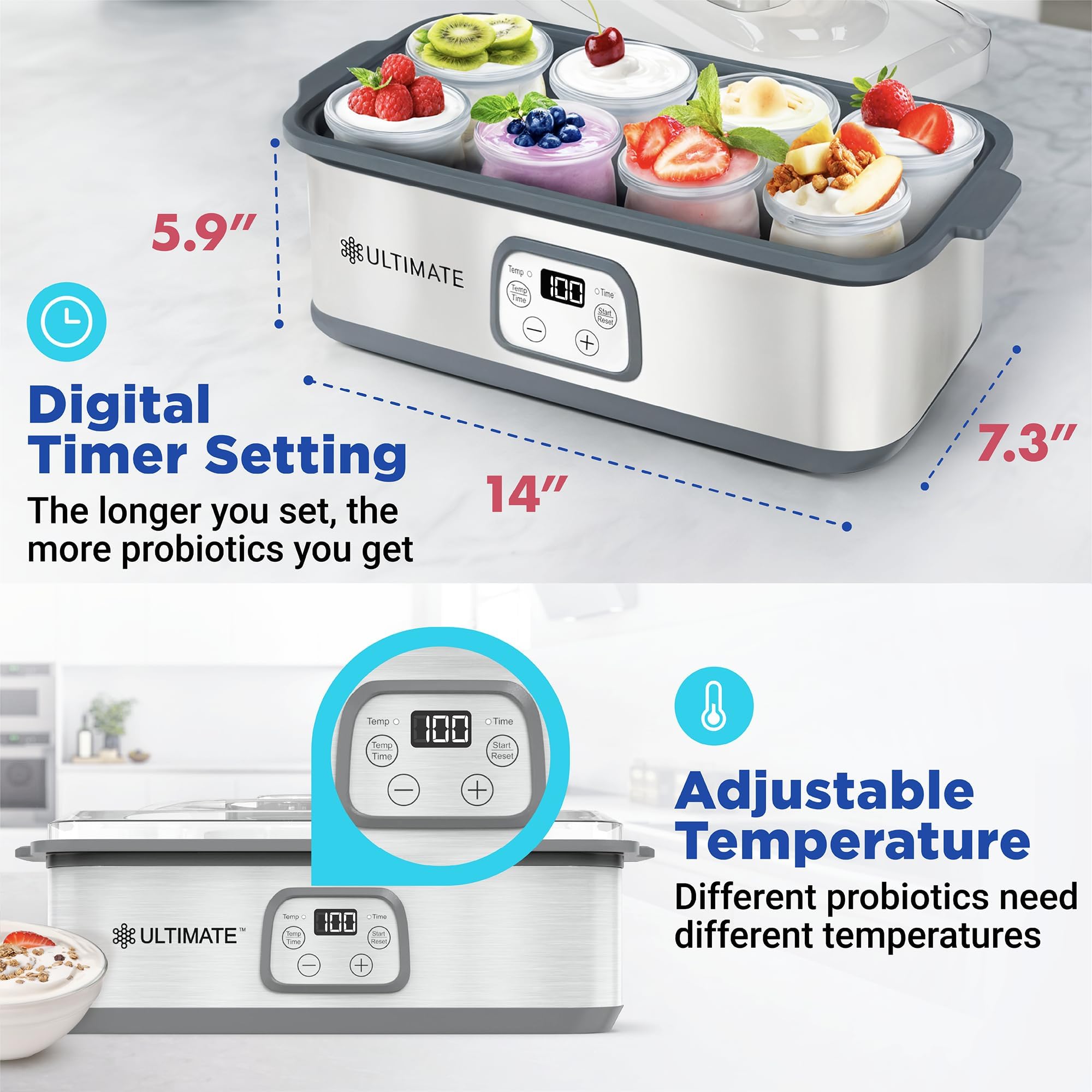 - 𝗔𝗱𝗷𝘂𝘀𝘁𝗮𝗯𝗹𝗲 𝗧𝗲𝗺𝗽𝗲𝗿𝗮𝘁𝘂𝗿𝗲 𝗖𝗼𝗻𝘁𝗿𝗼𝗹 & 𝗥𝘂𝗻 𝗧𝗶𝗺𝗲 – 𝟭𝟬𝟬% 𝗕𝗣𝗔-𝗙𝗥𝗘𝗘 – The Ultimate Probiotic Yogurt Maker has adjustable temperature settings from 68-131°F and can run for up to 48 hours, ensuring the perfect environment to culture your yogurt for tons of probiotics. The machine is 100% BPA free and comes with two large glass containers with BPA free lids to ensure the health of you and your family.