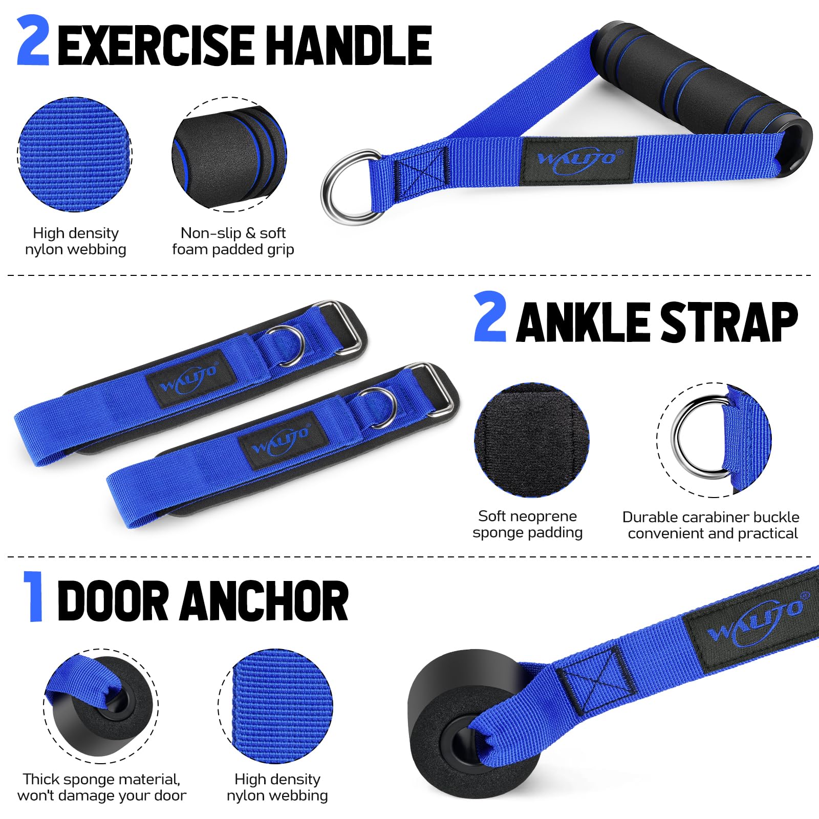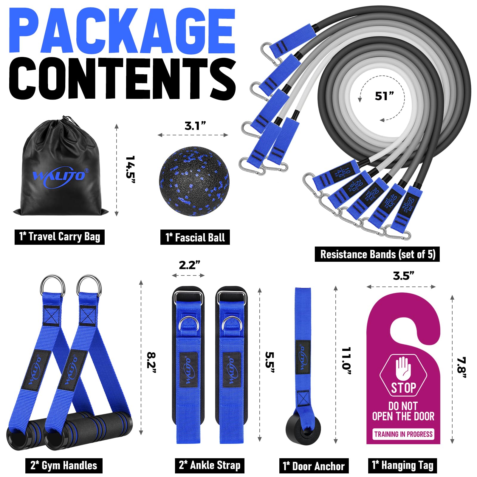 - Resistance Bands Set Includes :5 x Resistance Bands;2 x Ankle Straps;2 x Soft Handles;1 x Door Anchor;1 Massage ball ;1 x Carrying Bag ;1 Exercise Guidance