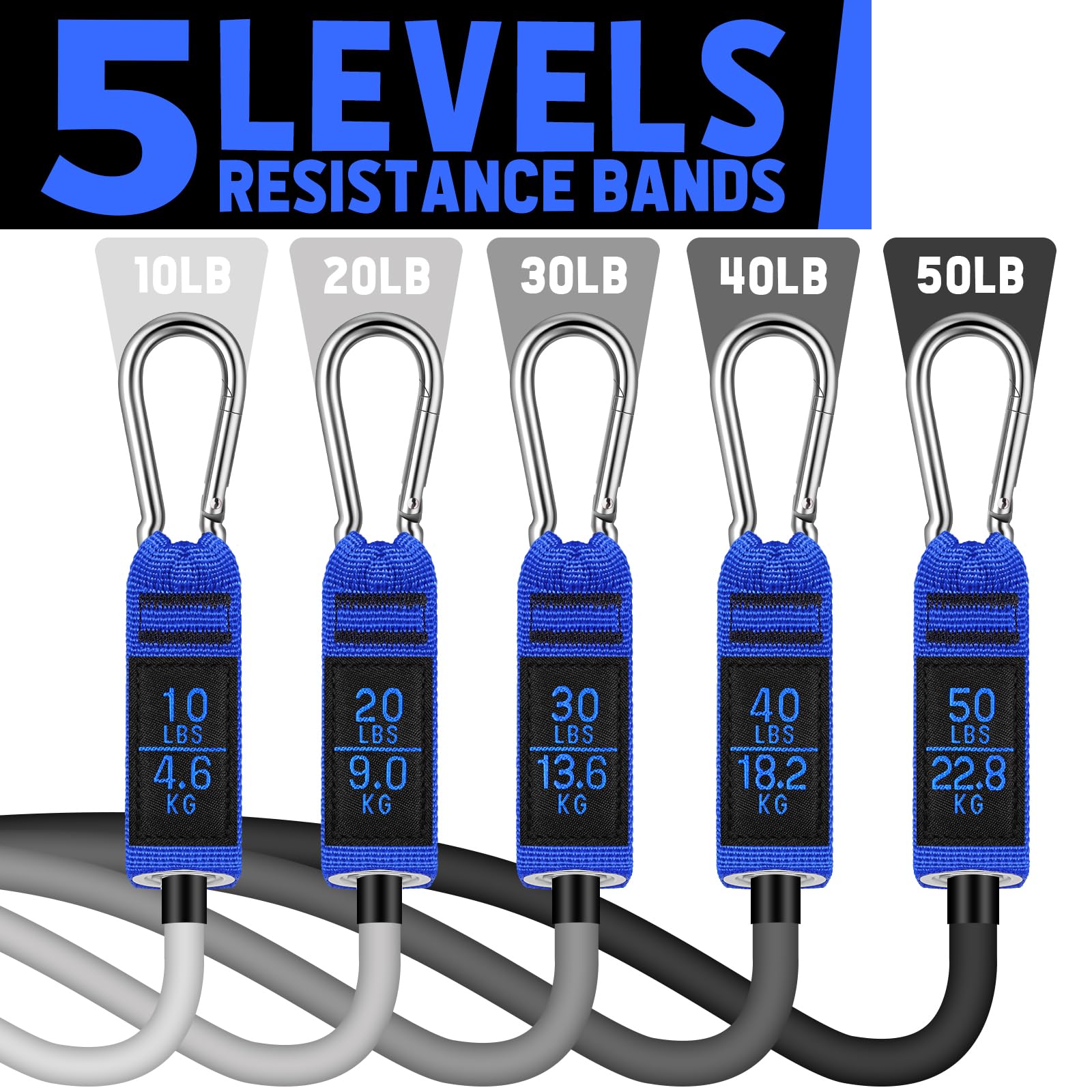 - 5 Level Exercise Bands Set: Walito resistance bands set come with 5 different resistance levels: 10lbs, 20lbs, 30lbs, 40lbs, and 50lbs in 5 different colors, both in 51″. You can use the bands independently or in any combination with a maximum resistance level of 200lbs, make you can clearly feel the muscle building up after every stretch.