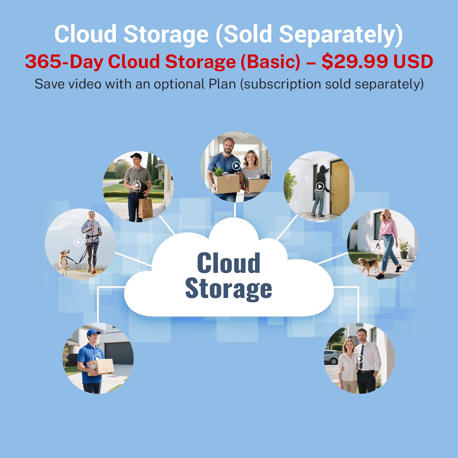 - Cloud Storage: Keep your video footage safe and accessible anytime with secure cloud backup. (sold separately)