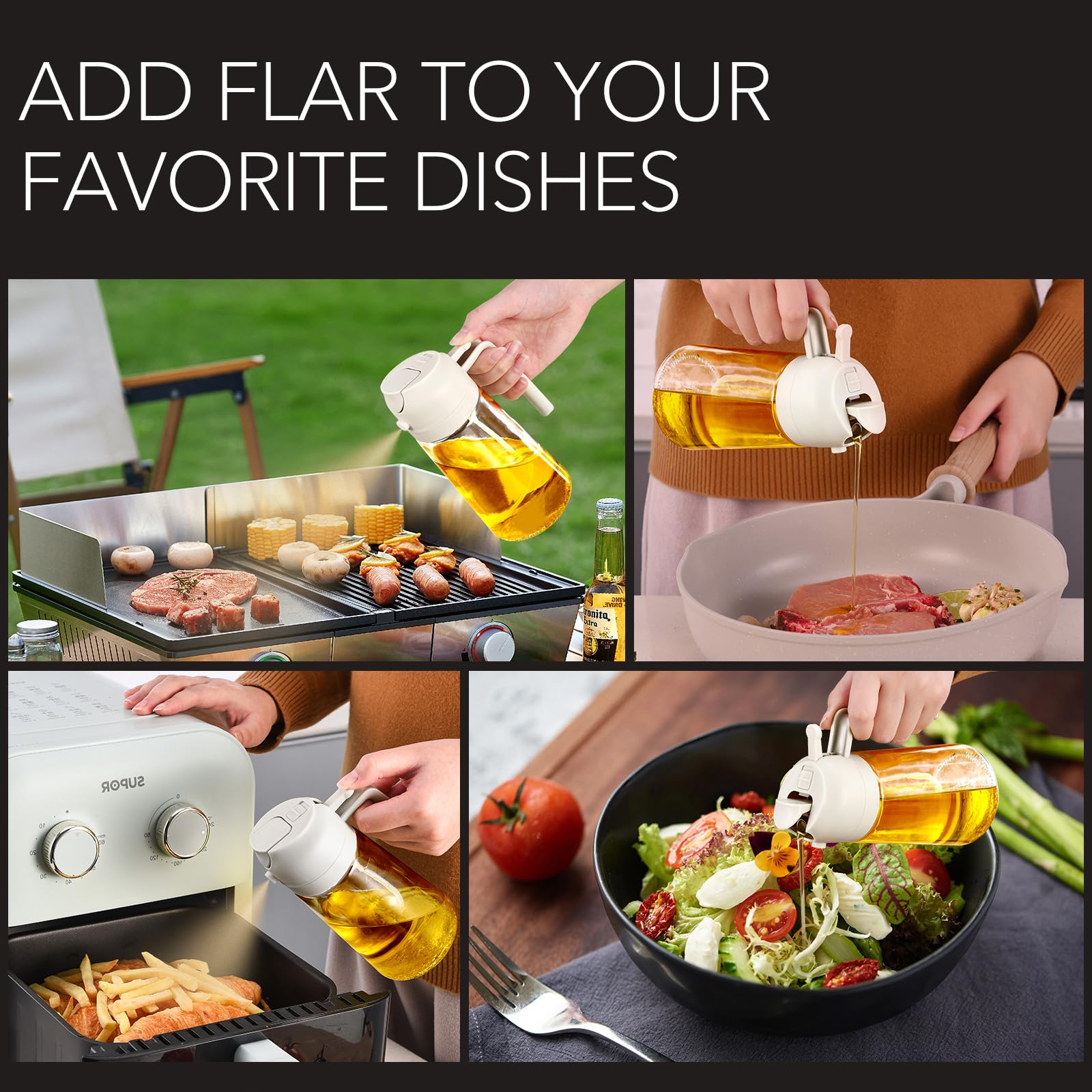 - Dual-Function Design & Multi-Purpose: Oil spray bottle for cooking offers the convenience of both spraying and pouring oil, suitable for a wide range of food preparation processes such as salad dressing, griddle, roasting, grilling, make your kitchen efficient and organized